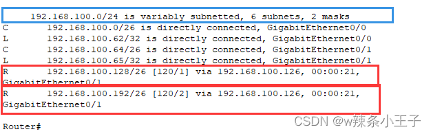 查看路由器4的路由学习·情况,显示已经成功学习到128和192网段,而且汇总成了192.168.100.0/24的子网掩码