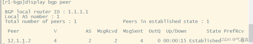 [r1-bgp]peer 12.1.1.2 as-number 2 对端IP地址,及对端所在的AS号