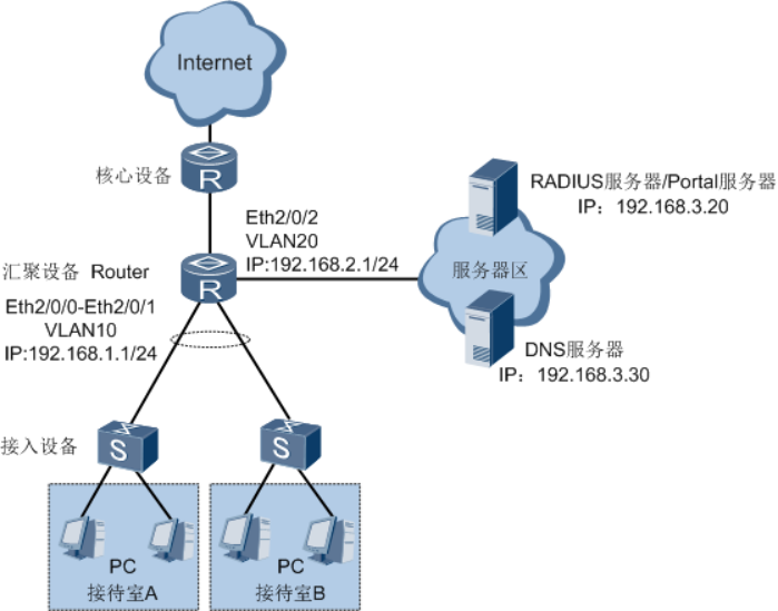 由于门户认证的灵活部署,适用于移动用户;及集群设备路由器和访问端口属于两层网络。因此,可以部署两个层次的门户认证,并集成 RADIUS服务器(与 RADIUS服务器和门户服务器集成)在集成设备路由器上。访问网访问终端的访问控制.
