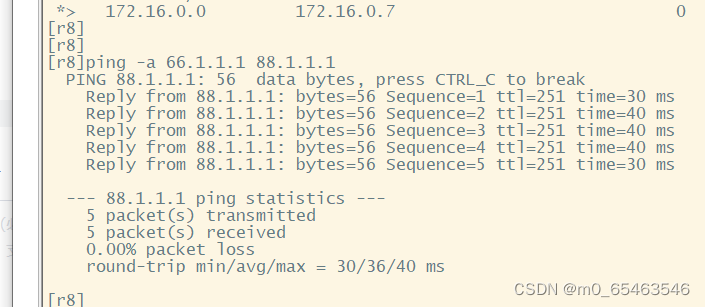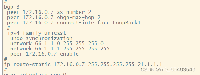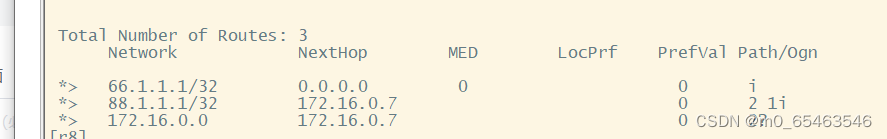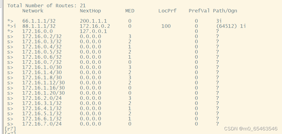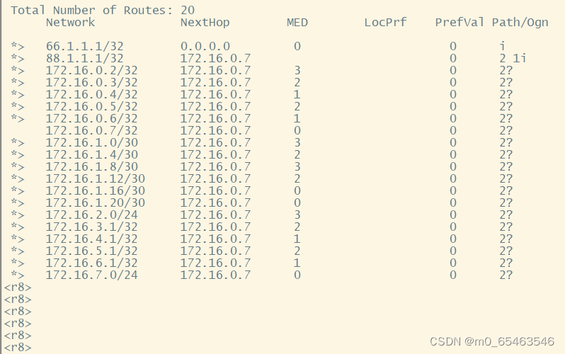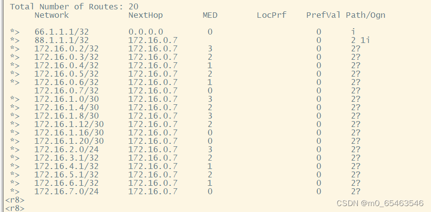 由于进行重发布操作时,传递到R8的BGP路由条目很多,所以我们可以在R7上进行一次路由聚合的操作,由于我们AS2域内网段都是基于172.16.0.0/16划分,所以我们可以直接写一条聚合路由为: