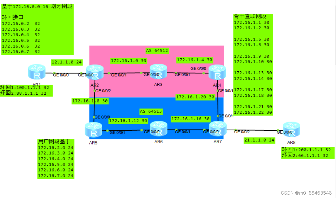1:R2-R7 每个路由器都有用于建邻居的环回接口;同时还有连接用户的环回接口;最终,这些连接用户接口网络需要能够与R1/R8的环回接口进行通信