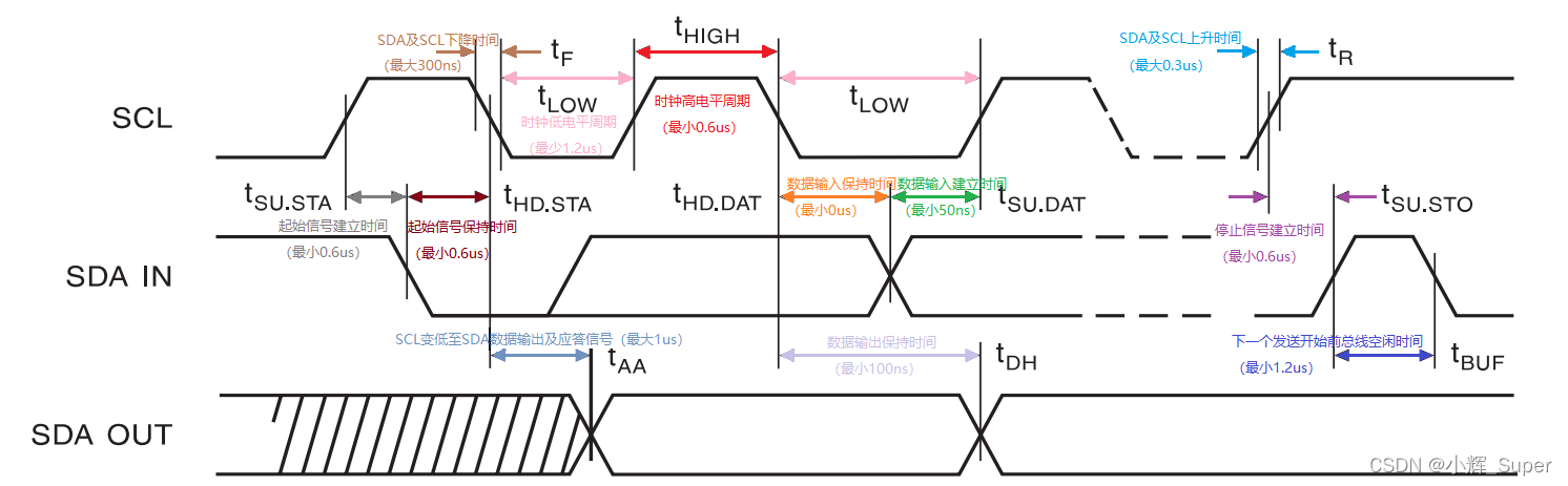 下图左边1至8个钟周期发送1个字符地址数据(搜索+阅读/写),在第九个钟表周期中从机器上拉下SDA响应信号),继续传输第二个字符串。 如果在等待了很长一段时间后,SDA没有降低,这表明服务器很忙或无法与服务器通信,那么服务器需要发送停止信号结束通信(或发送起始信号重新建立通信)。