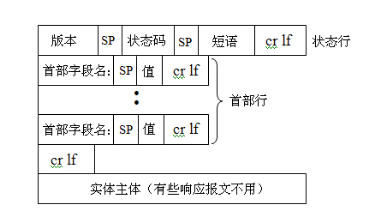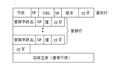 HTTP请求报文由请求行、首部行和实体主体组成,由浏览器发送给服务器。上面这张图中SP表示空格,cr lf表示回车和换行。
