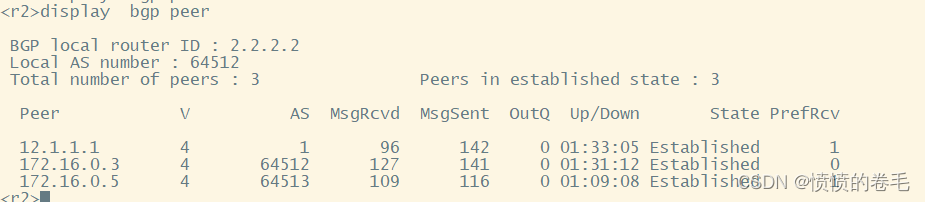 完成as2配置后,我们可以查看bgp邻居表,检查是否成功