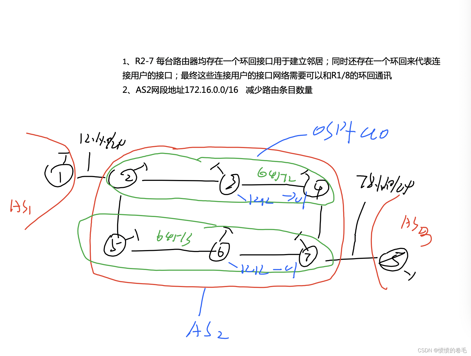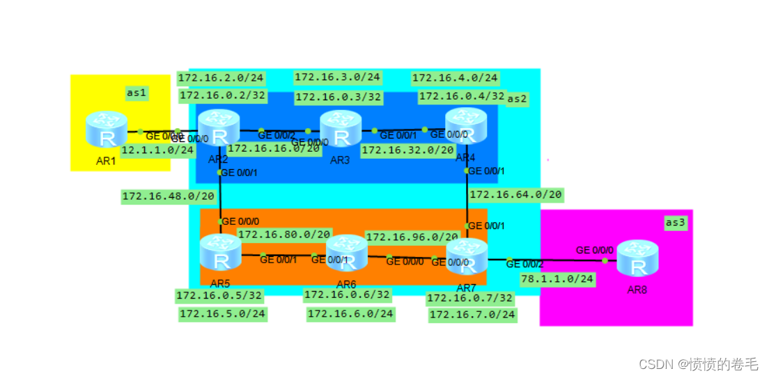 由于as2网络段较大,我们可以将内置的循环回路接口分为32位加密IP地址,用户循环回路网络段分为24位加密IP地址,核心链路网络段分为20位加密IP地址。