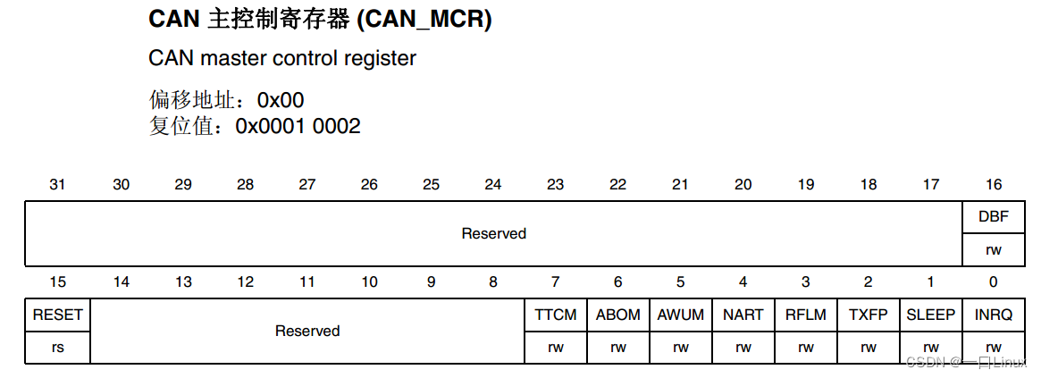 CAN_MCR主要控制台负责管理CAN的工作模式,并使用下面的控制台 bits实现控制。