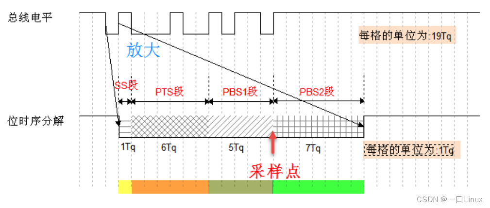 图中显示的CAN通信信号为每个数据点的19Tq长度,车队分区 comprises 1Tq,PTS分段为6Tq,PBS第1部分是5Tq,PBS2为7Tq的帐户。信号采样点位于PBS1和PBS2之间,通过控制每个段的长度,可以移动样品点的位置,以便准确地采样。