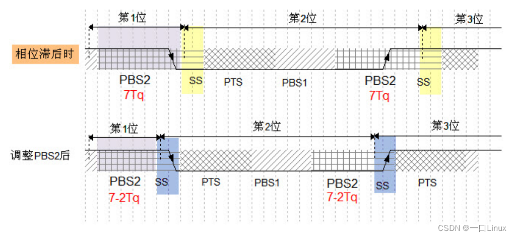 第二种相位滞后的情况如图 ,节点从线端跳到线端,检测到它的时序比总线的时序相对滞后 2Tq,这时控制器在前一个位时序中的 PBS2 段减少 2Tq 的时间长度,获得同步。