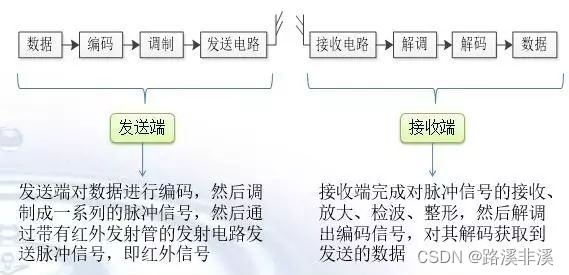 红外通信由两个部分组成: 发射器和接收器.发送器将数据编码,然后调制成一系列脉冲信号,然后,脉冲信号通过红外发射器的发射电路传输,即红外信号。接收端完成脉冲信号的接收、放大、检索和塑化。然后解码编码信号,通过解码发送的数据检索.具体的如下图所示: