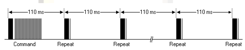 上面是命令代码的序列,但是,当你长时间保持遥控按钮时,在这这种情况下,使用NEC协议的红外遥控器发出一个周期110ms的重复代码。也就是说,每个用户按遥控按钮,远程控制发送指令代码后,不再发送指令代码,相反, 发送重复代码.如下图: