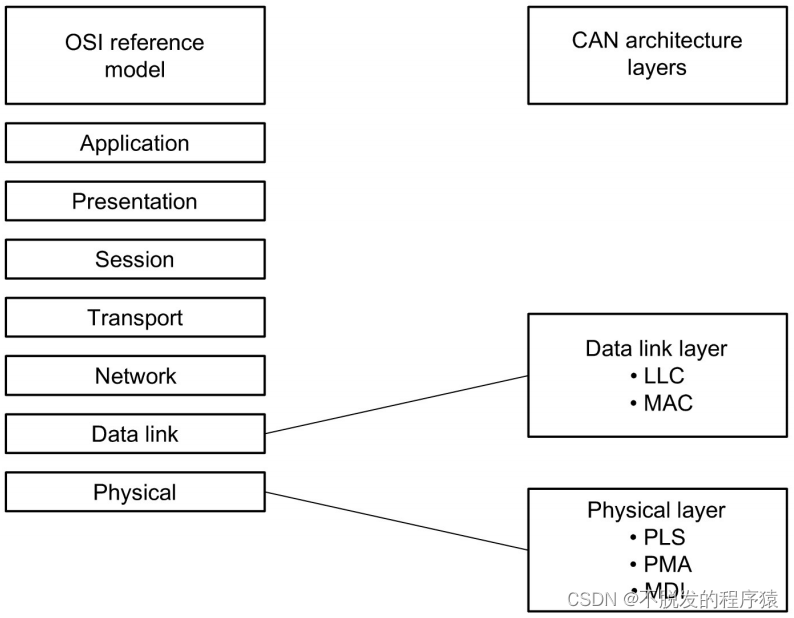 CAN通信协议标准(ISO-11898:2003)描述了设备之间如何传输信息,以及哪些层件符合开放系统互连参考模型(OSI)。实际CAN通信是在连接设备的物理介质中进行的,物理媒体的特性由模型中的物理层定义。ISO11898系统结构定义了七层,OSI模型的最低两个层是数据链层和物理层。如下图所示: