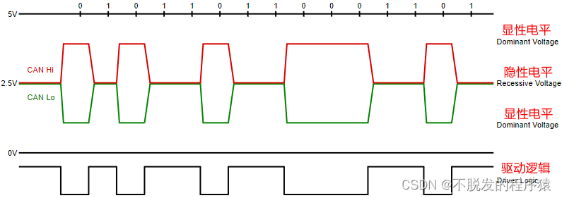 在CAN总线上,CAN信号由CAN_H和CAN_L线之间的电压差表示。CAN 总线上的电位差分为显性电平(Dominant Voltage)和隐性电平(Recessive Voltage),其中,显而易见的电解是逻辑的0,无形电解体是逻辑的1。