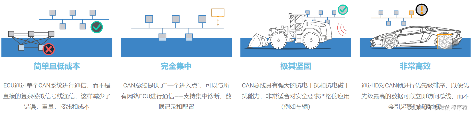 CAN协议主要用于汽车的各个组件之间的通信,取代昂贵和繁琐的配线包。该协议的鲁棒性使它同样适用于自动化和工业环境。