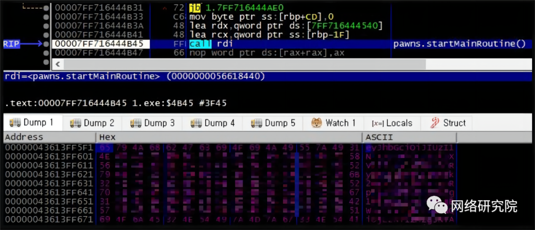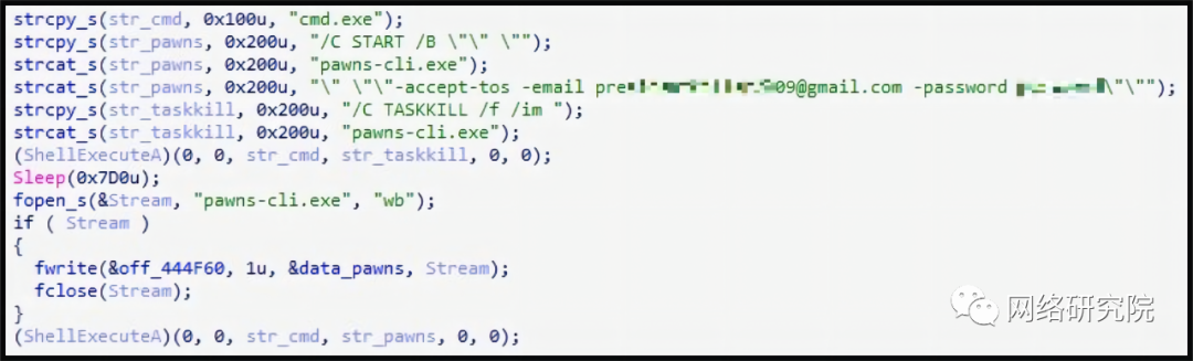 在最近的观察中,攻击者使用 DLL 形式的 Pawns,并以编码字符串形式提供他们的电子邮件和密码,并使用“Initialize()”和“startMainRoutine()”函数启动它。