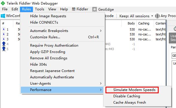 标记位置控制了oSession的两个参数值的设置,当勾选了Simulate Modem Speeds时,将设置 request-trickle-delay和response-trickle-delay,request-trickle-delay的值表示每KB的数据在上传时将延迟多少毫秒。response-trickle-delay是每KB下载的数据将延迟多少毫秒,如果网络本身已经相当快,在此设置的值可以大约计算在打开仿真后上传和下载带宽,例如,默认下载延迟为150ms,上传延迟300ms,计算模拟带宽的近似方法如下: