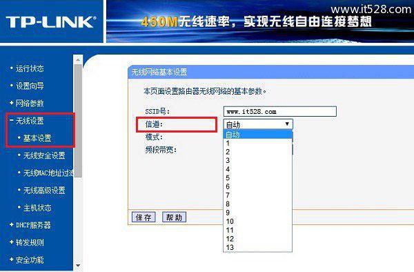 进入路由器设置接口后,在左边单击“无线电设置”,然后单击“基本设置”,在右边可以看到路由器的“频道”设置,这里默认是“自动”,也可以手动选择,有1-13选择,如下面所示。