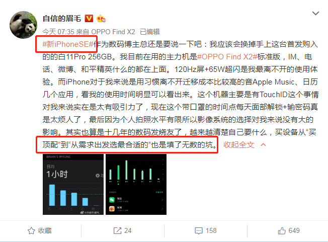 这是不真实的,甚至OPPO,一个朋友的生意,加入了乐趣。iPhone发布后,自称为数字博客的OPPO副总裁沈正毅也对iPhoneSE大加赞赏,并认真听取了他的发言。他发布消息说,自从iPhone11发布后,他就开始着手开发它了。现在他使用的是OPPO FindX2标准版本,但鉴于苹果的优秀苹果音乐,这也是他使用苹果手机作为备份机的原因之一。从他的表情来看,iPhone SE的触摸标识对他来说太有吸引力了。现在他也开始从需求中购买合适的设备,暗示他可能会把备份机换成苹果手机!