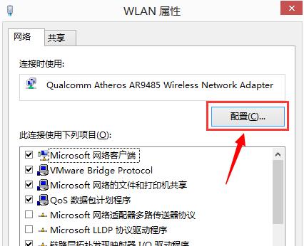 3、然后在打开的WLAN属性窗口中选择“配置”:再在打开的窗口中选择“电源管理”选项卡:取消对“允许计算机关闭此设备以节约电源”的勾选,再点击“确定”即可。