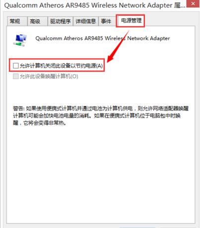 2、然后我们点击上图中的"配置",在弹出的窗口中切换到"电源管理"选项卡,如下图所示: