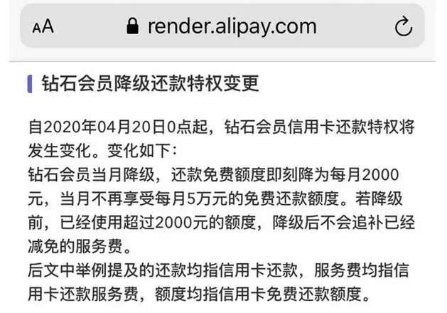 从4月20日起,如果钻石用户当月被降级,免费信用卡还款金额将立即从50,000降至2,000。