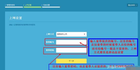3、之后进入到如下图这个界面,这个界面首先要确认自己的宽带上网方式是什么,一般情况是宽带拨号的话,装宽带的时候工作人员会给你提供宽带账号和宽带密码的,如果工作人员没有给你提供或者你是拉房东的网络请选择动态设置,如下图以宽带拨号为例子,对应输入相关内容如下图,然后下一步