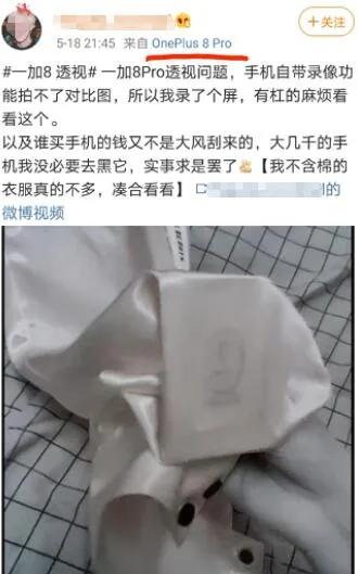 记者注意到,自5月18日晚以来,一加八专业手机的许多用户都在微博上发出声音和打印图片,证实了在过滤器下,有些面料确实可以透过手机看到,但有些面料却看不到。