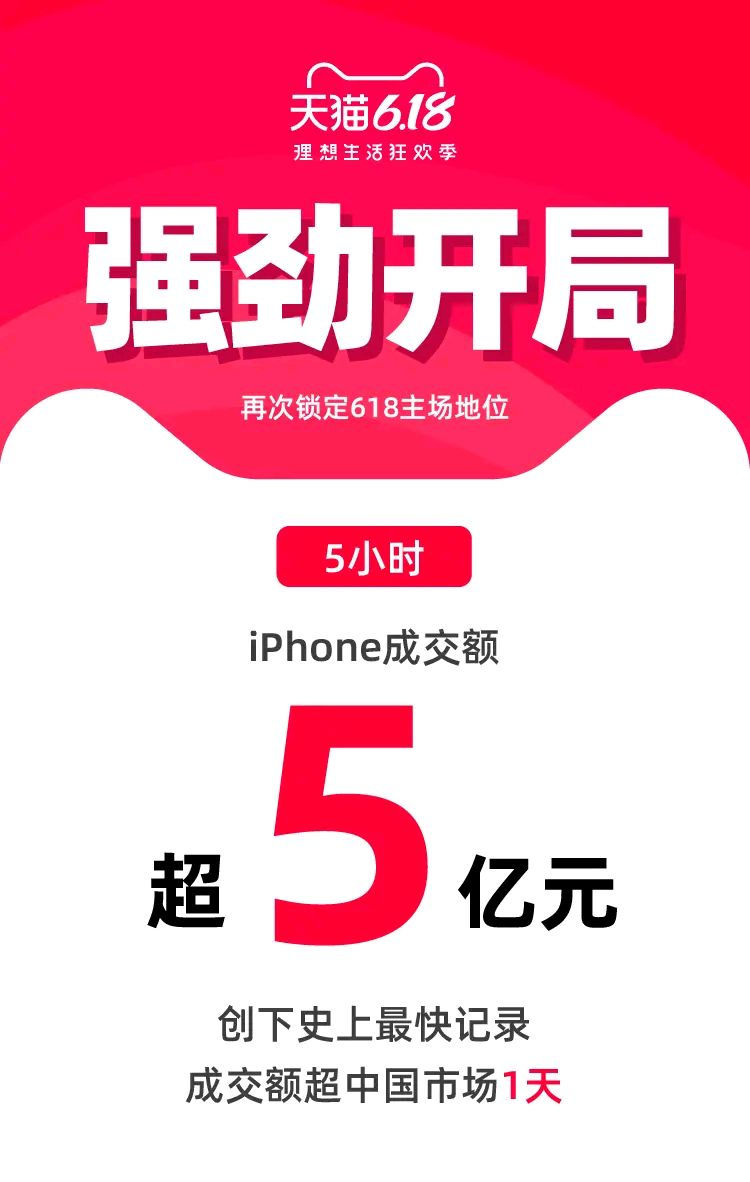 今天是天猫618正式开始销售的时间。阿里不断传播好消息,如1小时29分钟,淘宝直播贡献超过20亿,5小时苹果手机交易量超过5亿,10小时营业额超过去年全年等。这些对阿里来说都是好消息,但其中,苹果在5个小时内卖出了5亿部手机,这吸引了很多网民的抱怨。