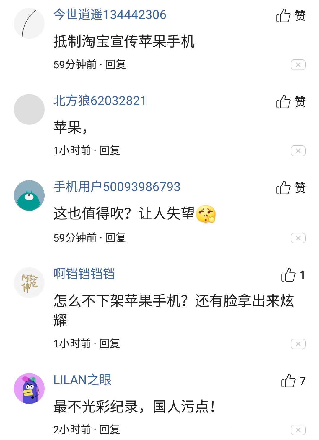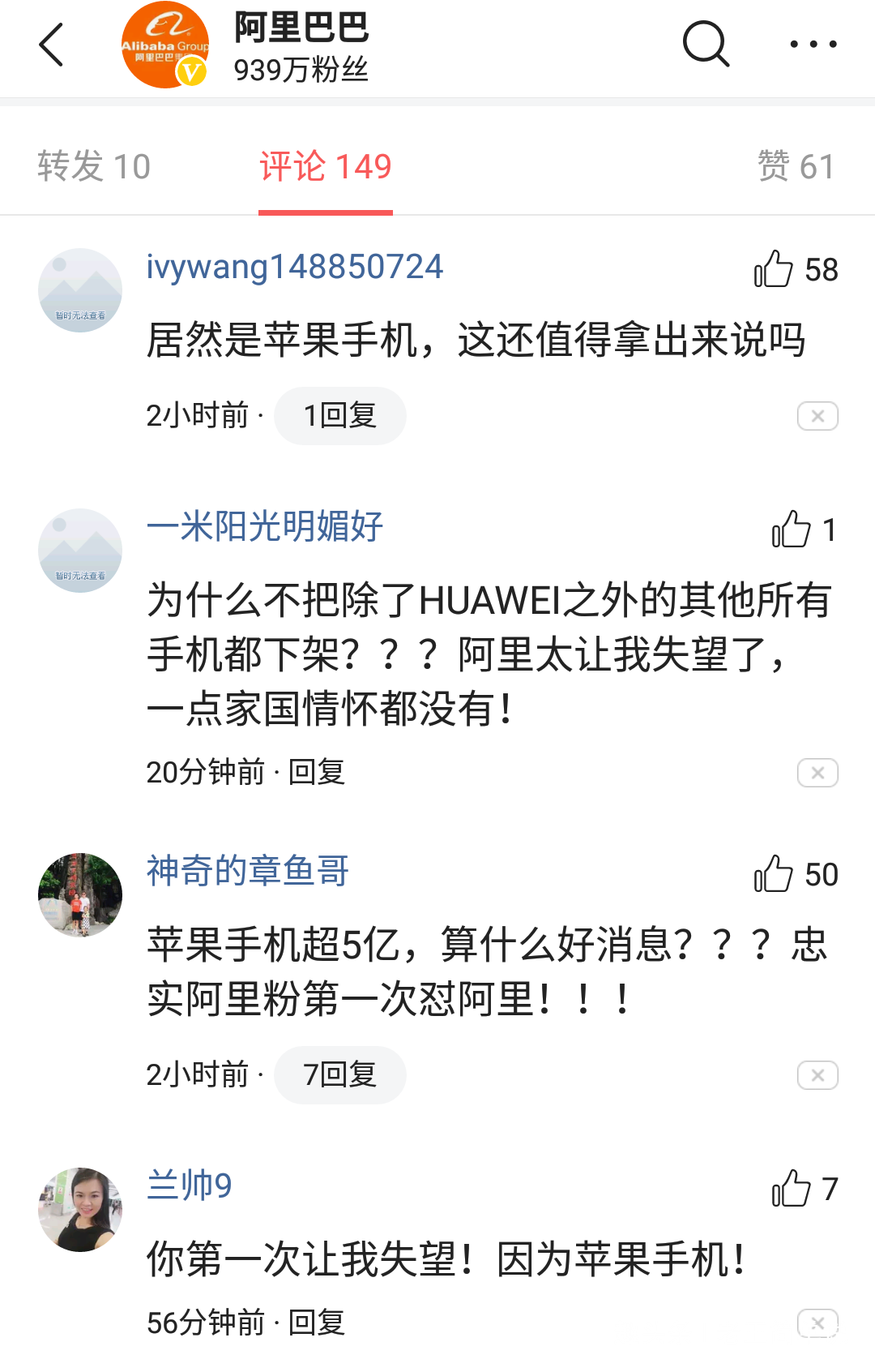 在这个敏感时期,天猫高调宣传苹果手机的大销售,无疑激怒了一些网民。当阿里发布苹果手机在五个小时内卖出5亿元的消息时,大多数网民的回答都是否定的。