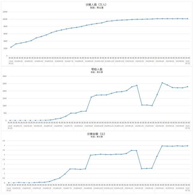 帮助人数和分摊金额则呈阶段性上升之势,且二者走势重合度极高。帮助人数的<500人、1500-2000人、>2000人三个阶段,分别对应分摊金额的<1.5元、3-3.5元、4元左右。