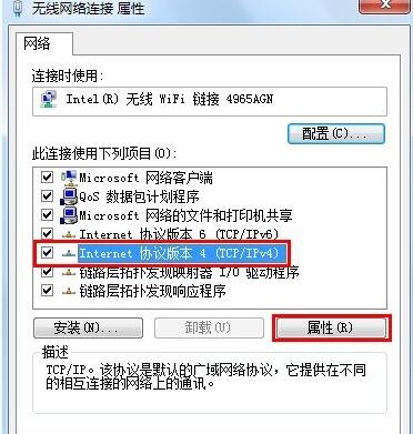 第四步:找到并点击 Internet协议版本4(TCP/IPv4),点击 属性。如下图所示: