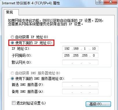 第五步:选择 使用下面的IP地址(S);设置IP地址为 192.168.1.10,子网掩码为 255.255.255.0,点击 确定。如下图所示:
