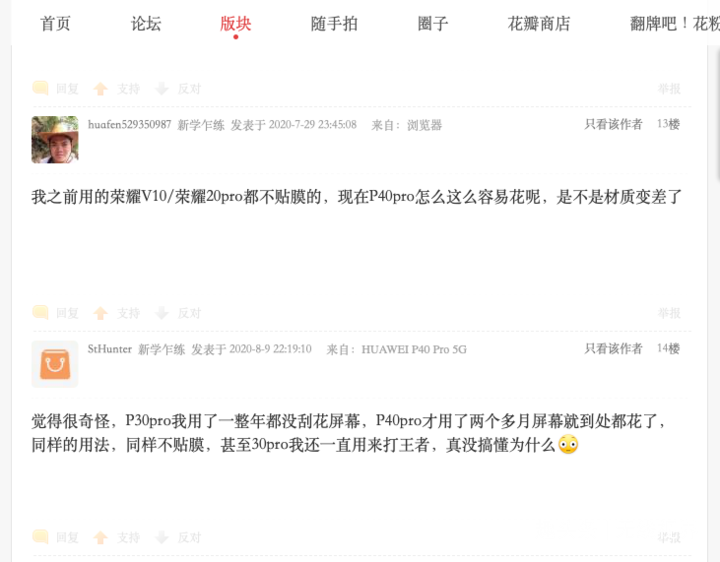 华为论坛中,有用户反映 P40 Pro 的屏幕不耐磨
