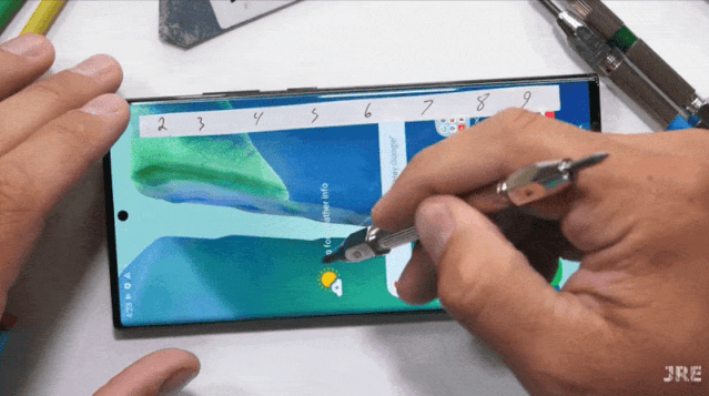 那三星 Note 20 ultra 的耐刮性怎么样呢?据油管博主 Zack Nelson 的测试,在 6 级莫氏硬度下,三星 note 20 ultra 的屏幕开始出现刮痕,并在 7 级硬度下出现了更深的凹槽。尽管如此,Zack Nelson 依然认为这款手机相当坚固耐用,原因可能是「同行衬的」。
